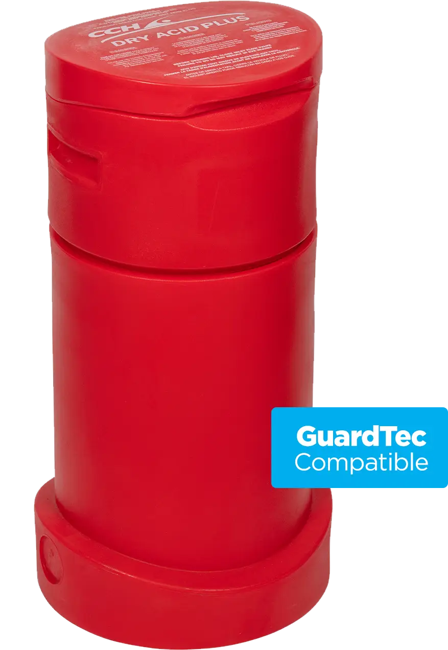 CCH Dry Acid Plus provides pH balancing and integrates inlet flow solenoid control for reliable operation while also preventing back flow. It features a custom color design to distinguish between other feeders and a compact, rugged roto-molded body. Combined with our proprietary formulation, CCH Dry Acid Plus, it offers the following benefits: